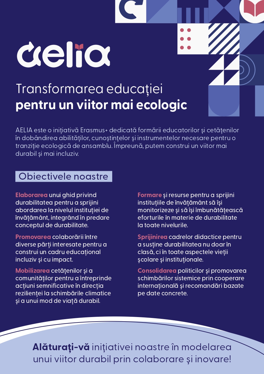 Proiectul AELIA contribuie la instruirea tuturor cetățenilor în vederea dobândirii abilităților și competențelor necesare pentru tranziția ecologică. Abordarea noastră implică o strategie bine structurată, prin participarea mai multor actori din mediile educaționale formale și non-formale, întreprinderi, și sectorul public.