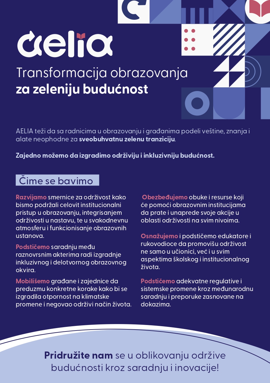 Projekat AELIA teži da doprinese procesu osnaživanja svih građana u pogledu veština i kompetencija neophodnih za zelenu tranziciju. Naš pristup obuhvata sveobuhvatnu strategiju koja uključuje širok dijapazon učesnika i aktera iz oblasti formalnog i neformalnog obrazovanja, poslovnog domena, građanskog društva i javnog sektora.